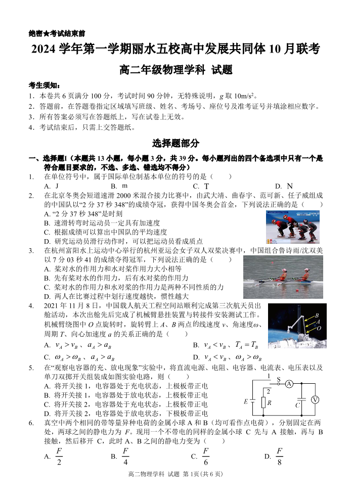浙江省丽水五校高中发展共同体2024 学年第一学期 10 月联考物理