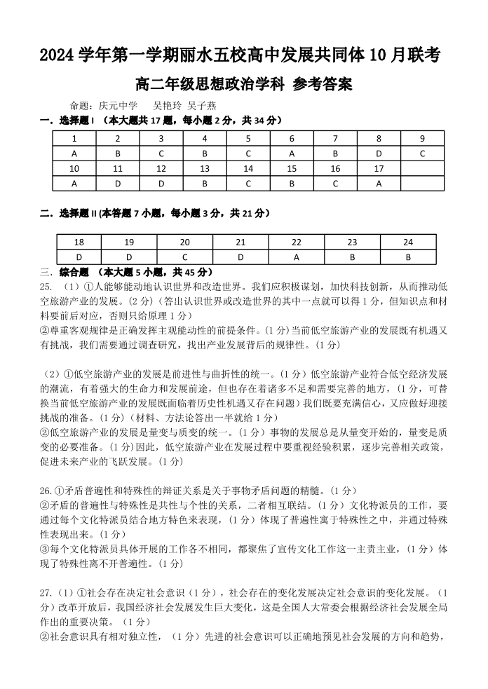 浙江省丽水五校高中发展共同体2024 学年第一学期 10 月联考政治答案