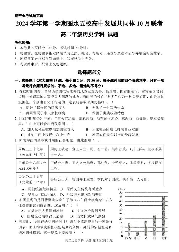 浙江省丽水五校高中发展共同体2024 学年第一学期 10 月联考历史