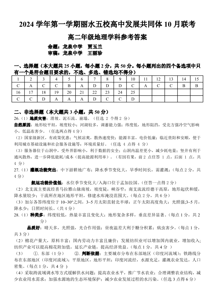 浙江省丽水五校高中发展共同体2024 学年第一学期 10 月联考地理答案