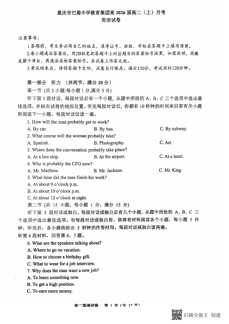 重庆市巴蜀中学教育集团高2026届高二(上)月考考试英语