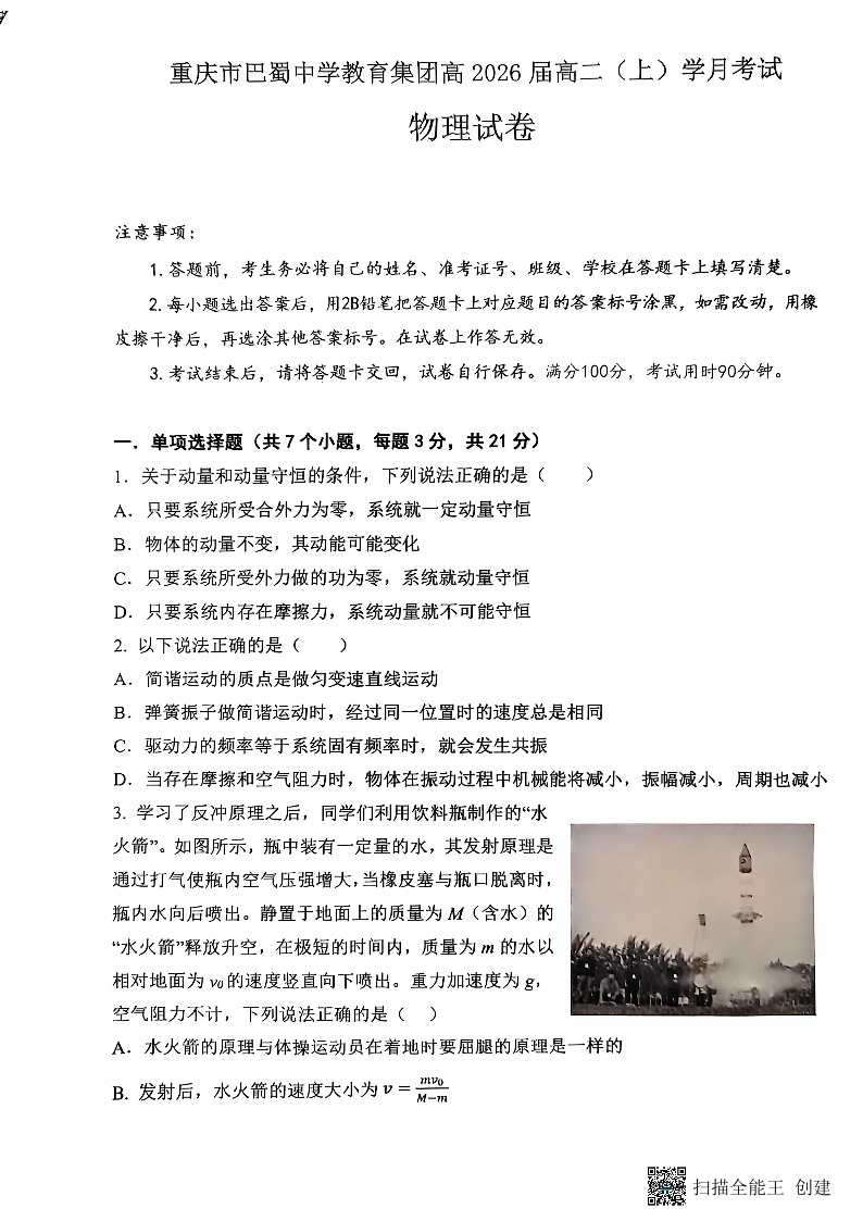 重庆市巴蜀中学教育集团高2026届高二(上)月考考试物理