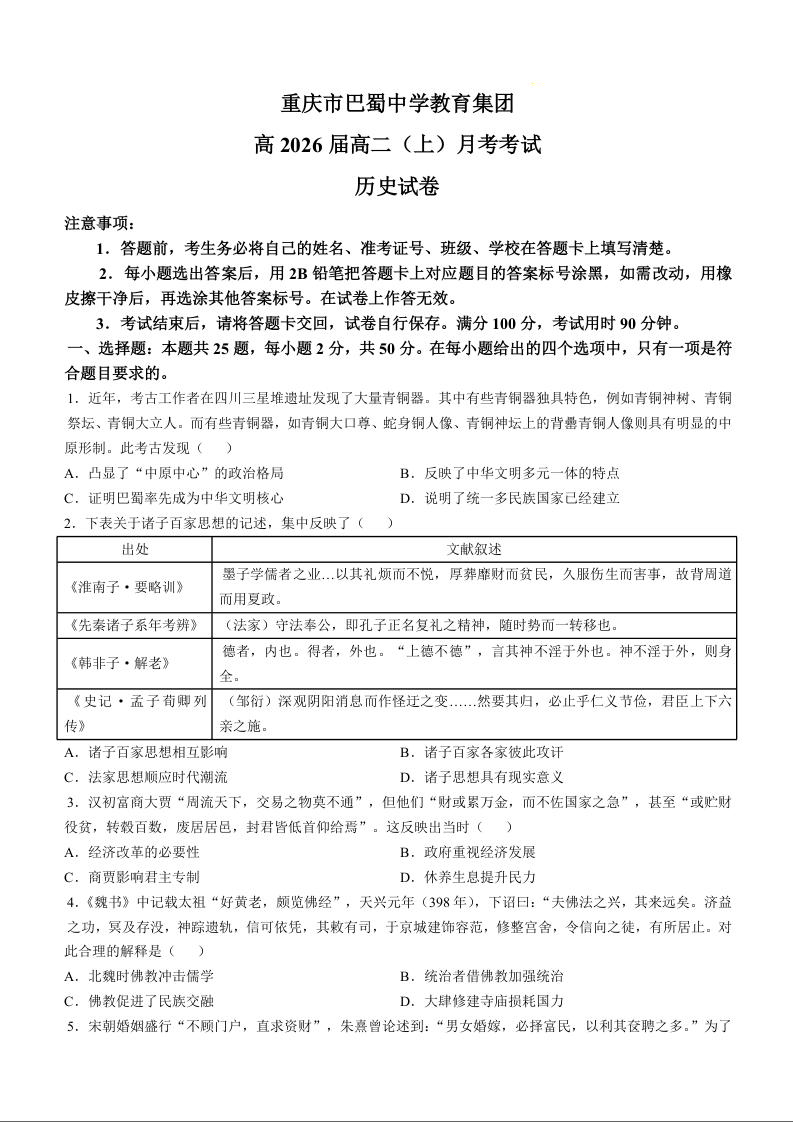 重庆市巴蜀中学教育集团高2026届高二(上)月考考试历史+答案