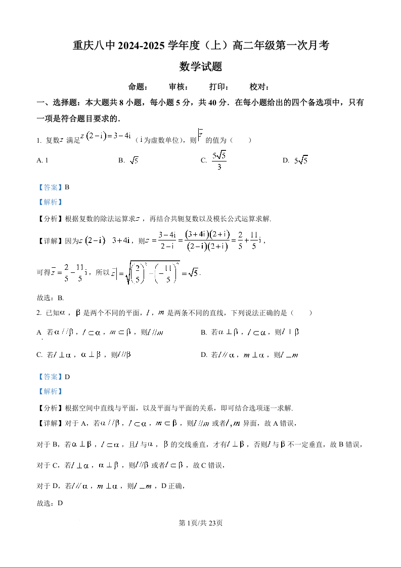 重庆市第八中学校 2024--2025学年度(上)高二年级第一次月考数学(解析版)