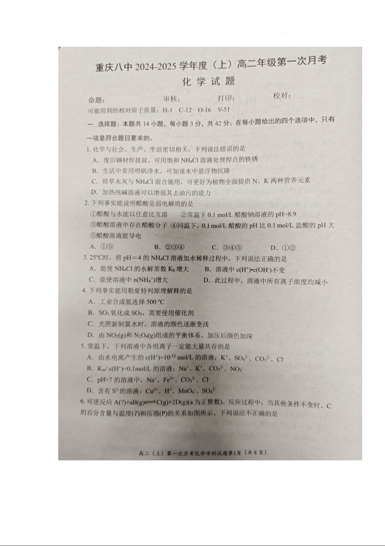 重庆市第八中学校 2024--2025学年度(上)高二年级第一次月考化学+答案