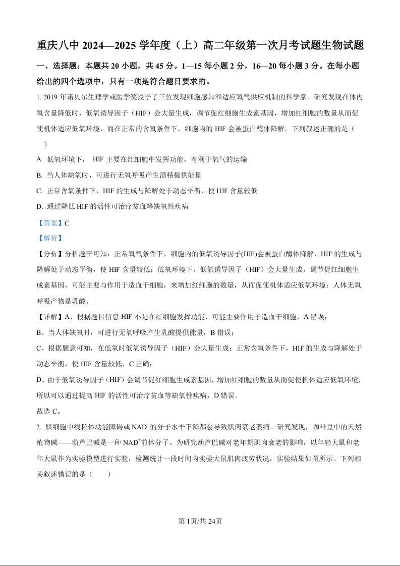 重庆市第八中学校 2024--2025学年度(上)高二年级第一次月考生物(解析版)