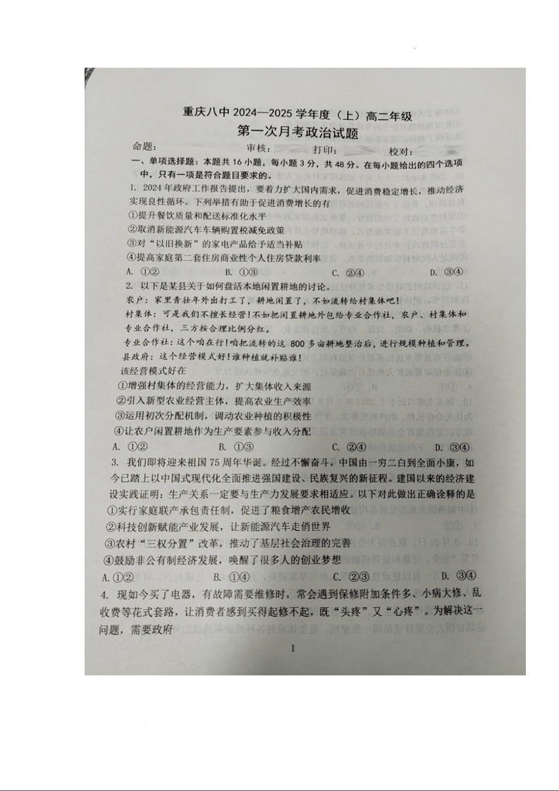 重庆市第八中学校 2024--2025学年度(上)高二年级第一次月考政治