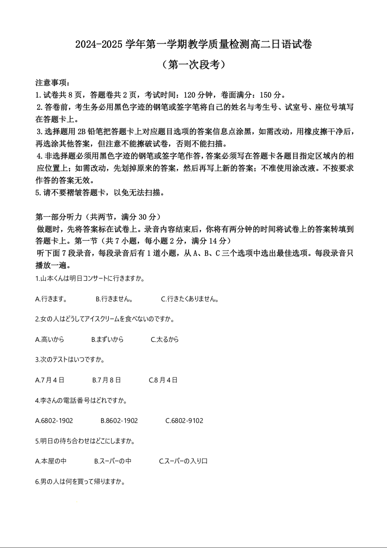 广东省三校2024-2025 学年第一学期教学质量检测日语+答案