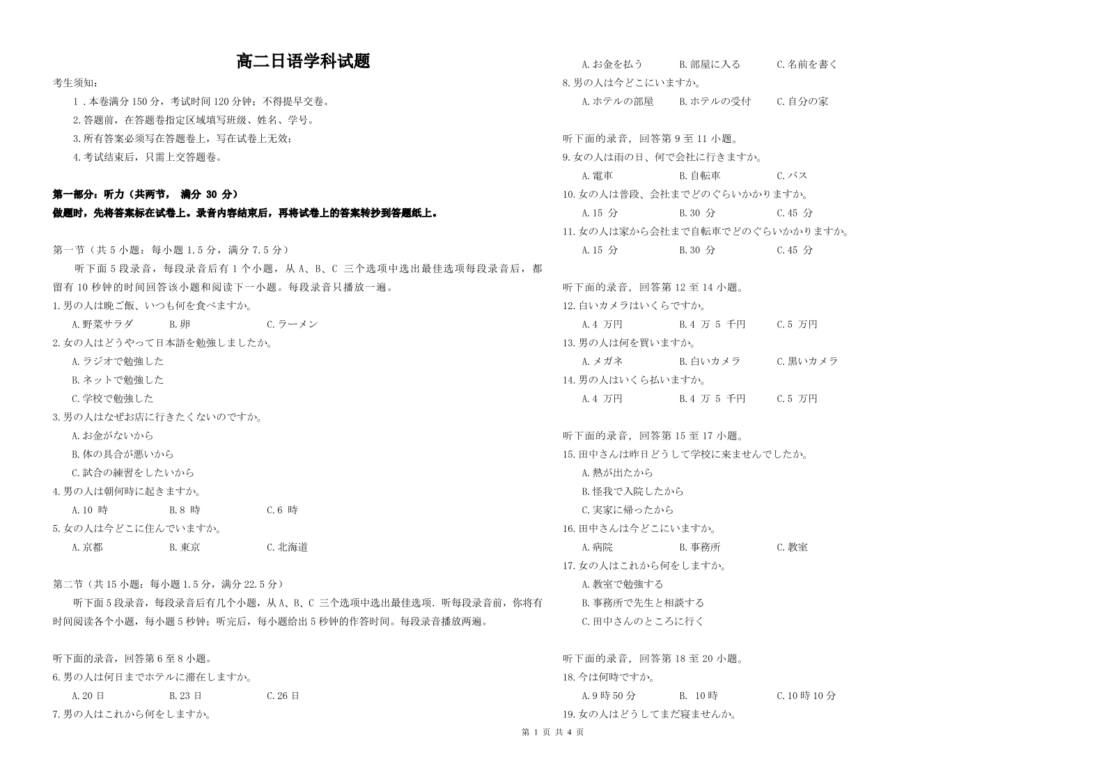 湖北省新高考联考协作体2024 年湖北部分名校高二 10 月联考日语