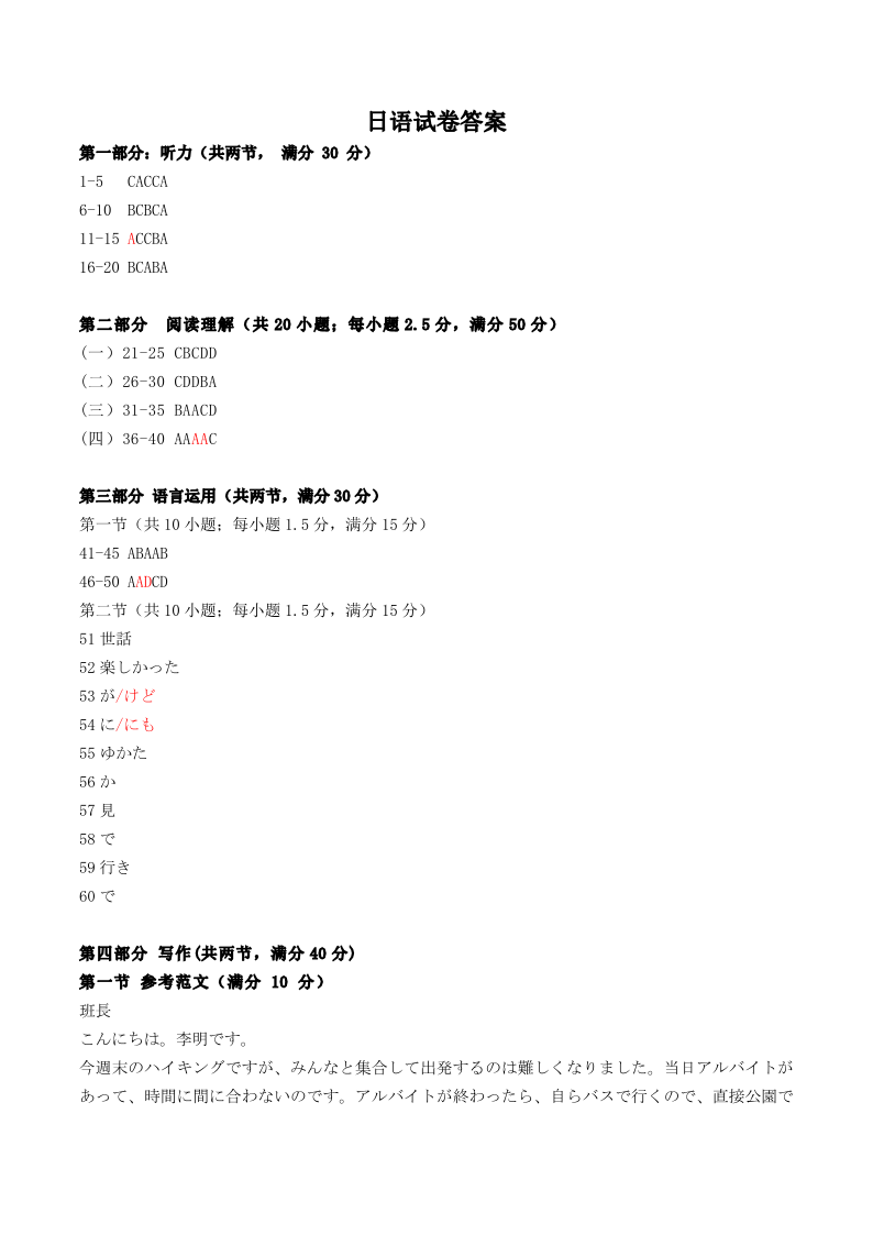 湖北省新高考联考协作体2024 年湖北部分名校高二 10 月联考日语答案
