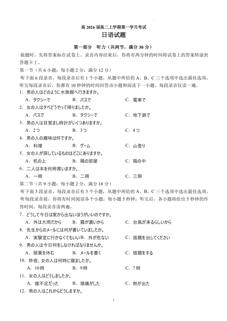 四川省泸州市泸县第五中学高2023级高二上学期第一学月考试日语
