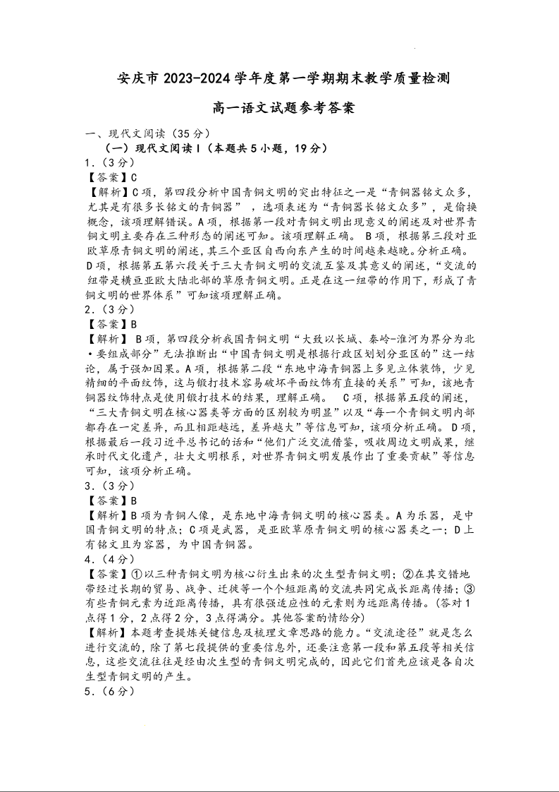安庆市2023-2024学年高一上学期期末教学质量检测试题语文答案