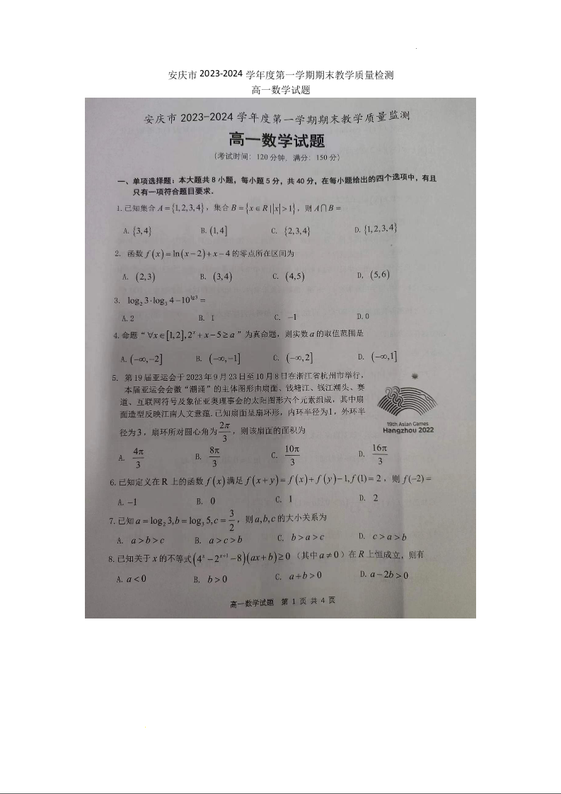 安庆市2023-2024学年高一上学期期末教学质量检测试题数学