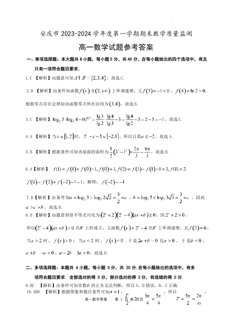 安庆市2023-2024学年高一上学期期末教学质量检测试题数学答案