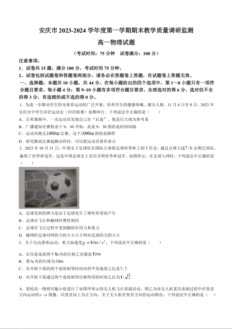 安庆市2023-2024学年高一上学期期末教学质量检测试题物理+答案