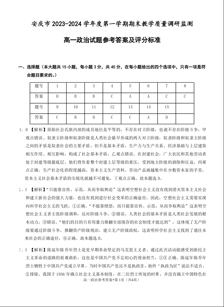 安庆市2023-2024学年高一上学期期末教学质量检测试题政治答案