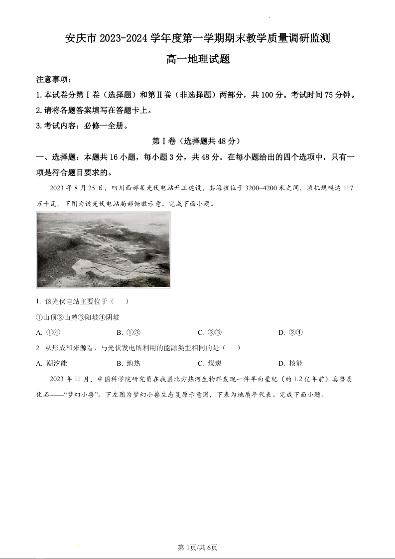 安庆市2023-2024学年高一上学期期末教学质量检测试题地理(原卷版)