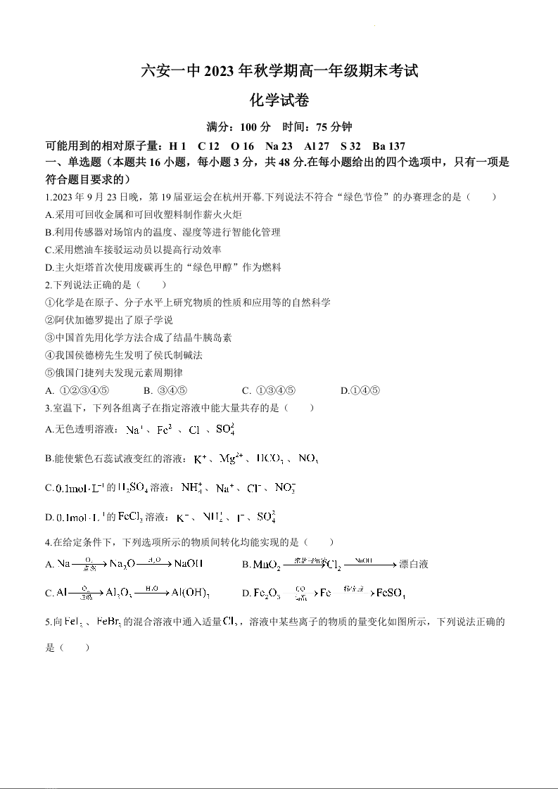 安徽省六安第一中学2023-2024学年高一上学期期末考试化学+答案
