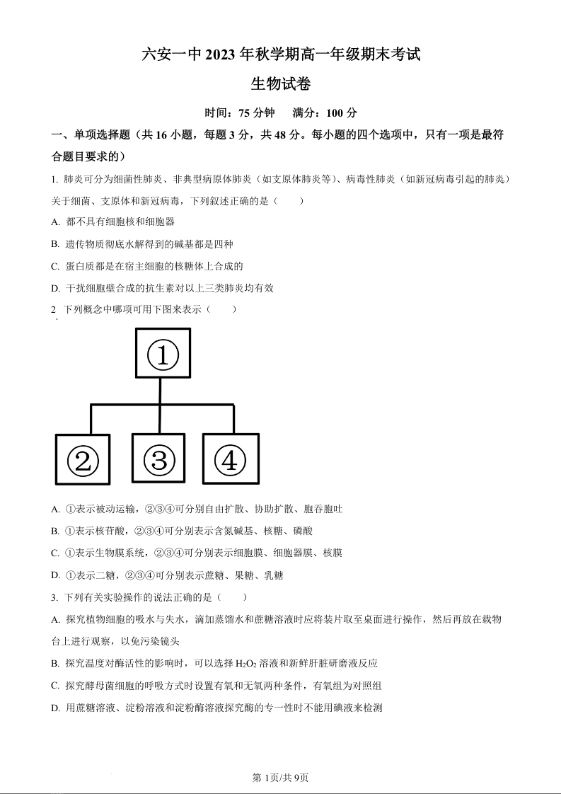 安徽省六安第一中学2023-2024学年高一上学期期末考试生物(原卷版)