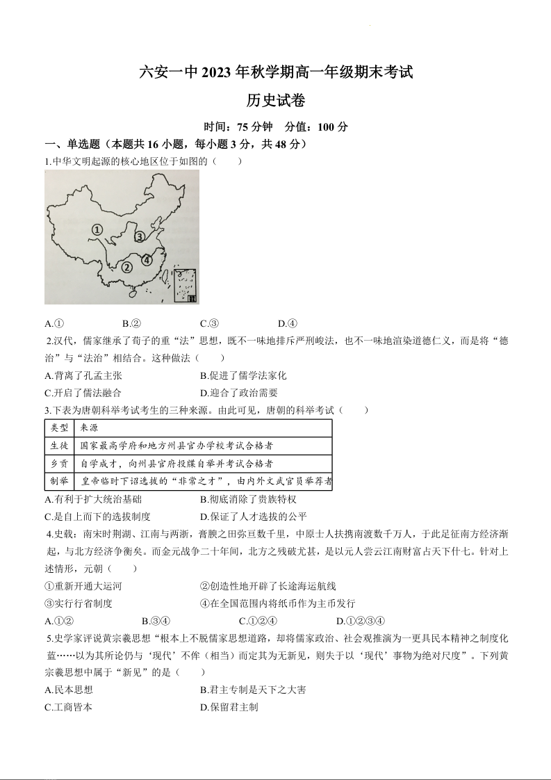 安徽省六安第一中学2023-2024学年高一上学期期末考试历史+答案