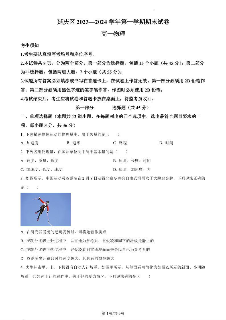北京市延庆区2023-2024学年高一上学期期末考试物理(原卷版)