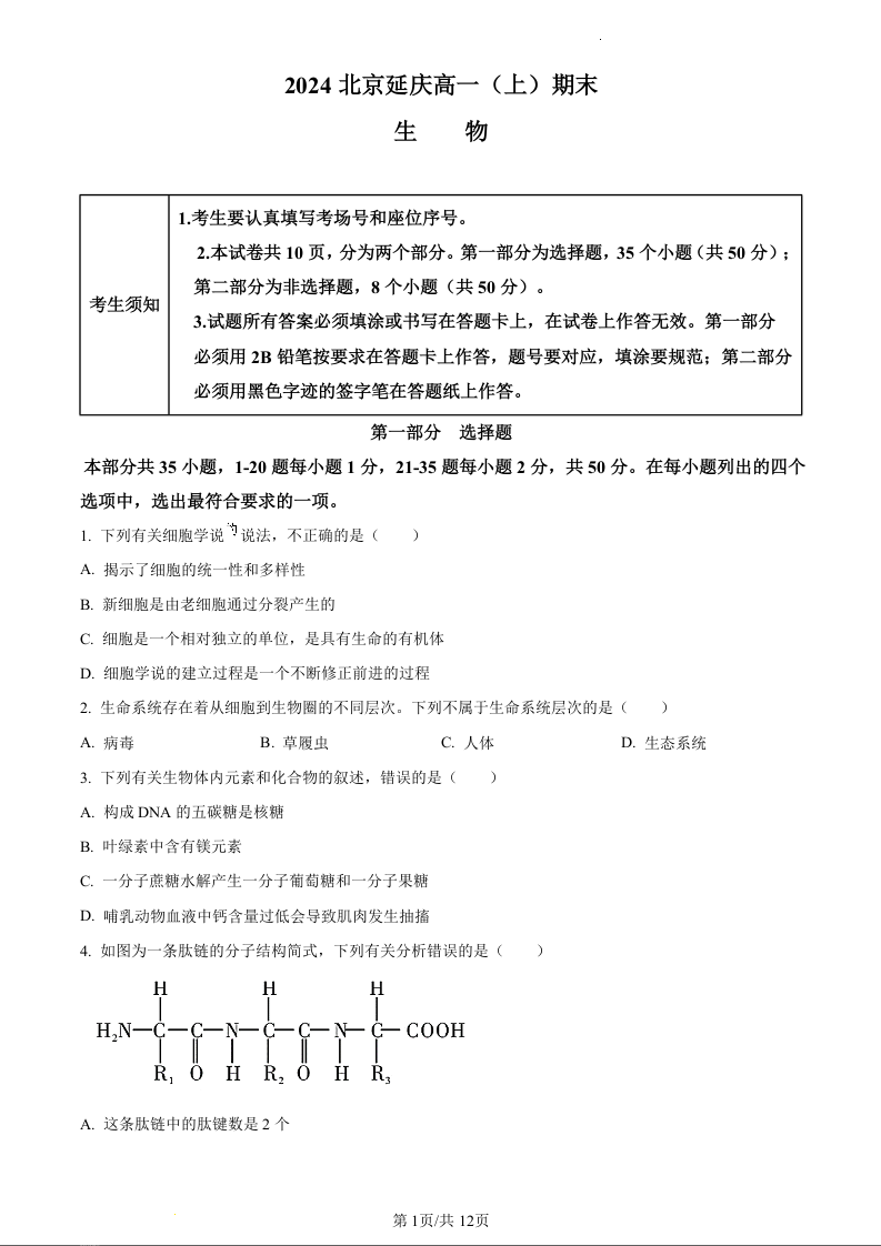 北京市延庆区2023-2024学年高一上学期期末考试生物(原卷版)