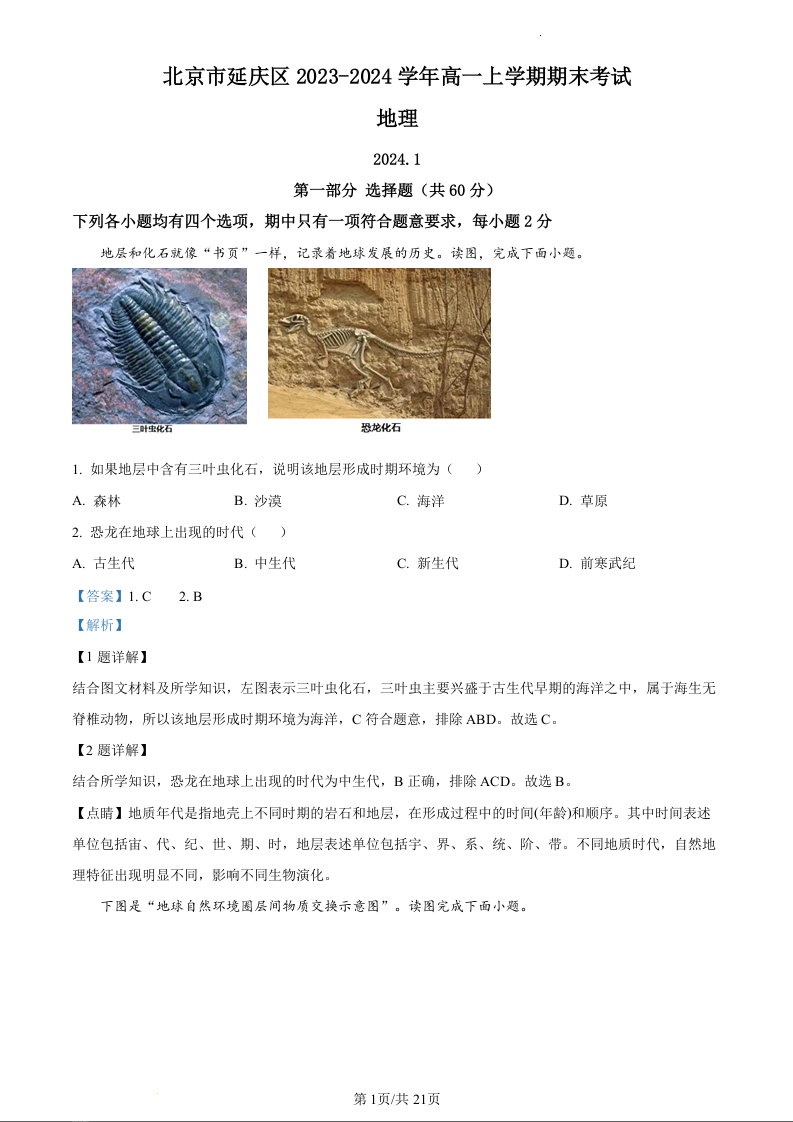 北京市延庆区2023-2024学年高一上学期期末考试地理(精品解析版)