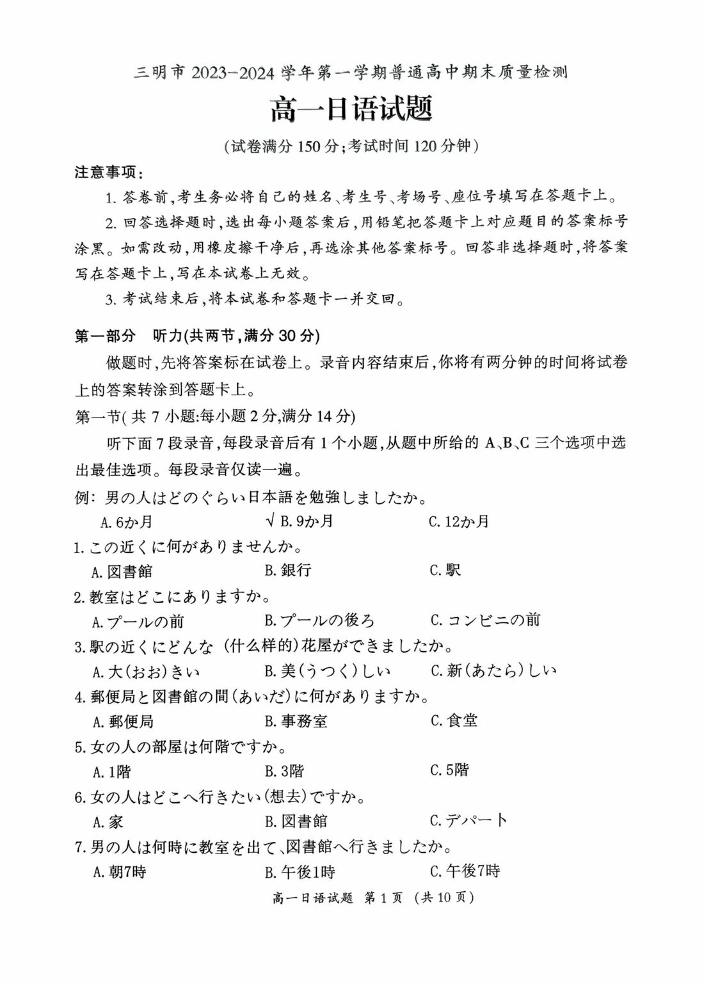福建省三明市2023-2024学年高一上学期期末考试日语
