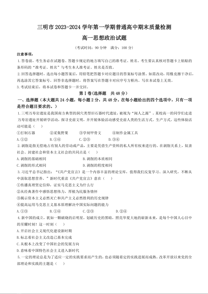福建省三明市2023-2024学年高一上学期期末考试政治+答案