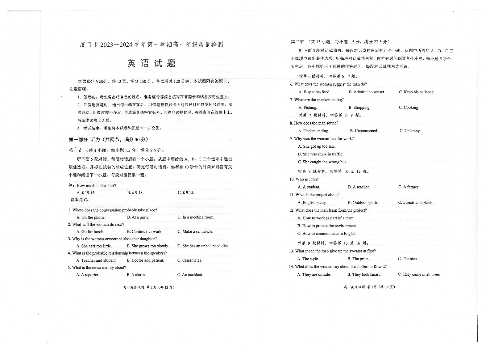 福建省厦门市2023-2024学年高一上学期1月期末考试英语