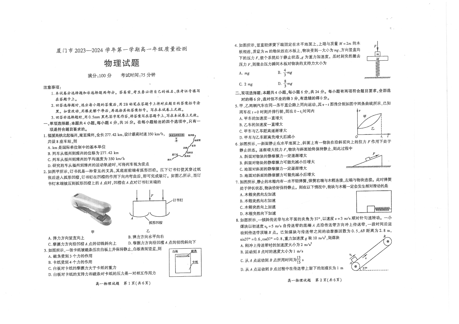 福建省厦门市2023-2024学年高一上学期1月期末考试物理
