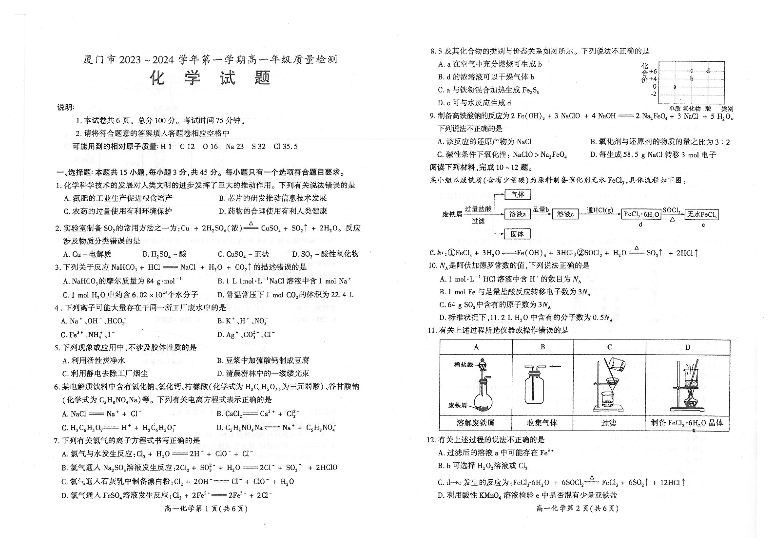 福建省厦门市2023-2024学年高一上学期1月期末考试化学