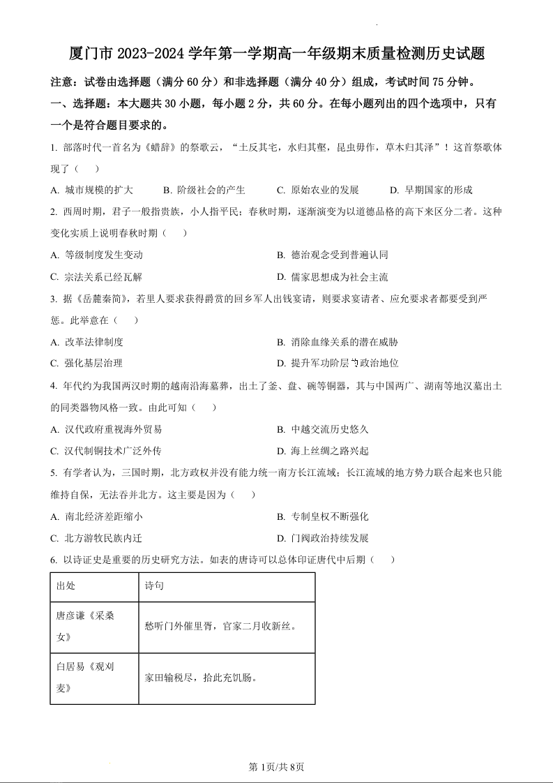 福建省厦门市2023-2024学年高一上学期1月期末考试历史(原卷版)