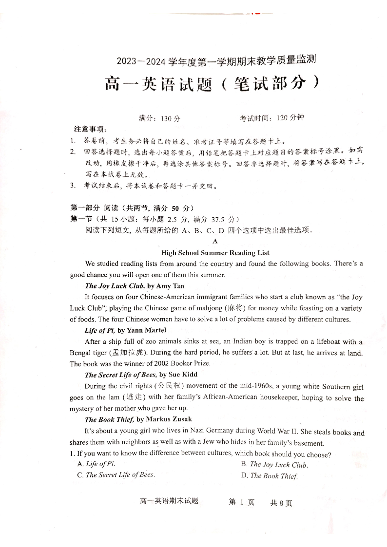广东省茂名市化州市2023-2024学年高一上学期1月期末考试英语