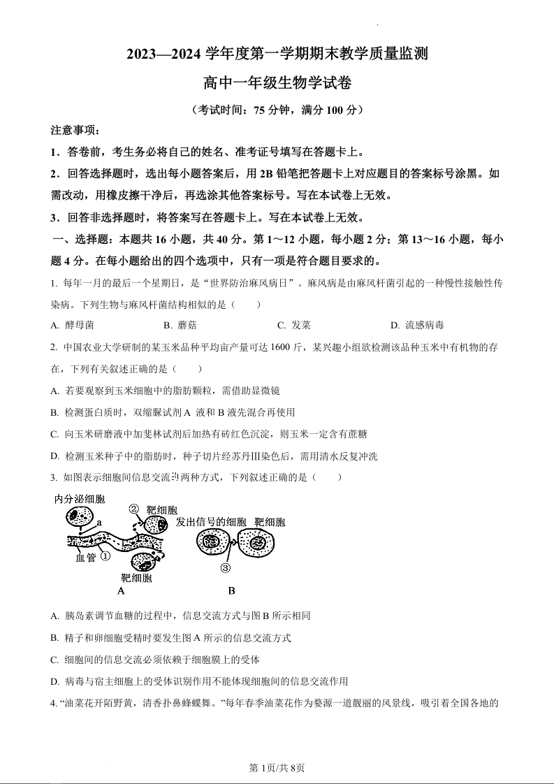 广东省茂名市化州市2023-2024学年高一上学期1月期末考试生物(原卷版)