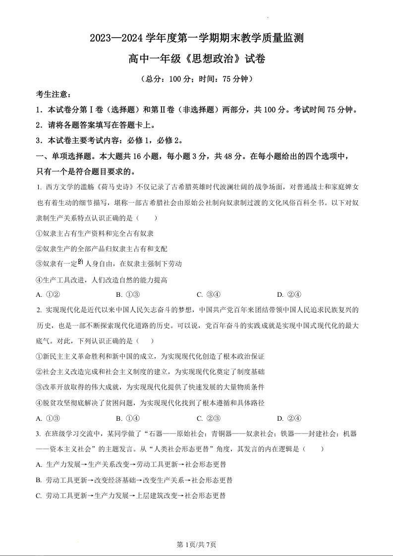 广东省茂名市化州市2023-2024学年高一上学期1月期末考试政治(原卷版)