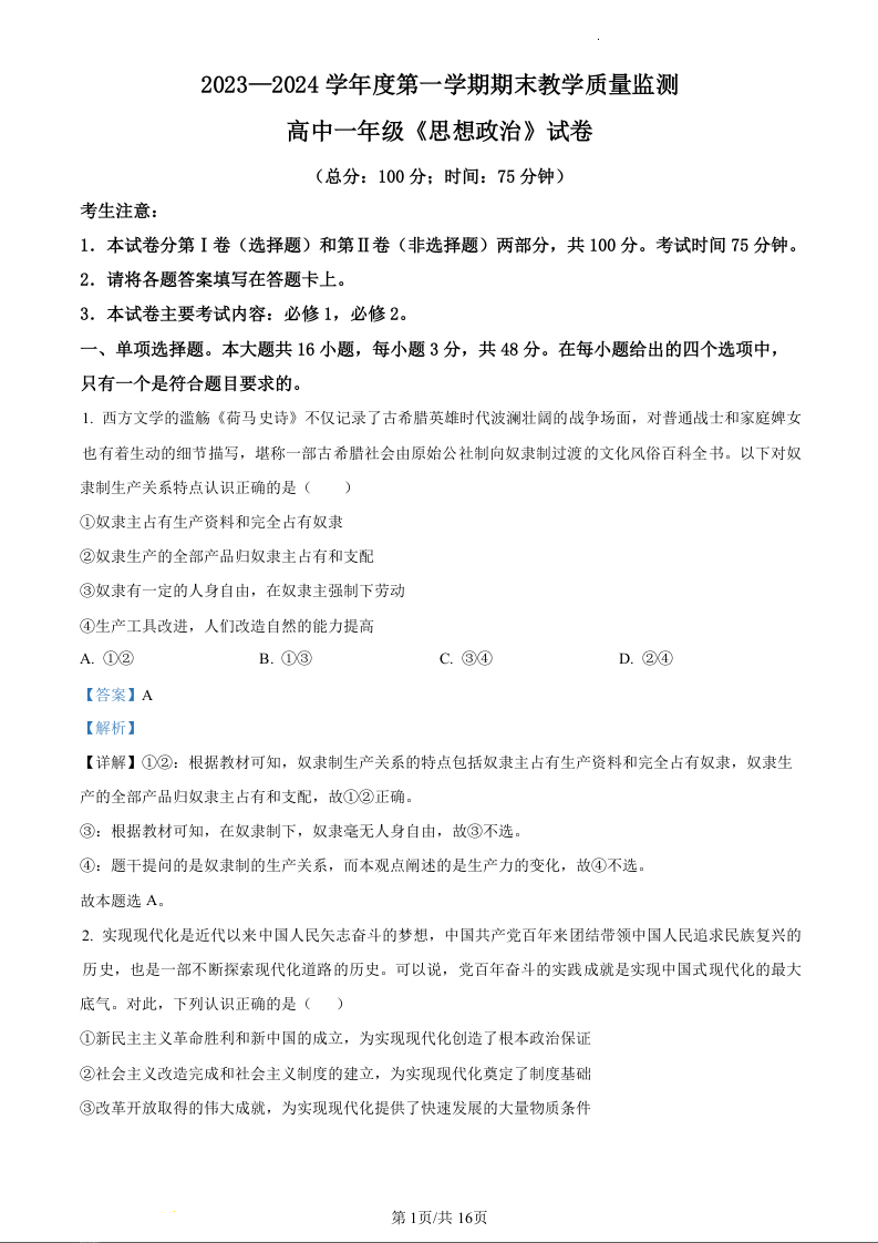广东省茂名市化州市2023-2024学年高一上学期1月期末考试政治(精品解析版)