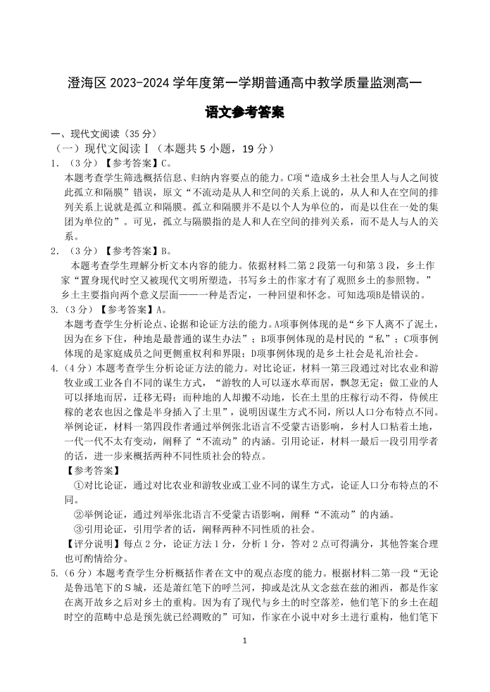 广东省汕头市澄海区2023-2024学年高一上学期1月期末测试语文答案
