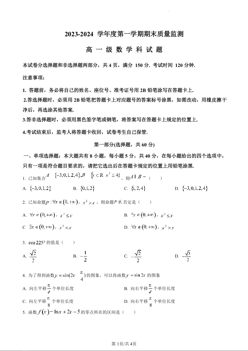 广东省汕头市澄海区2023-2024学年高一上学期1月期末测试数学(原卷版)
