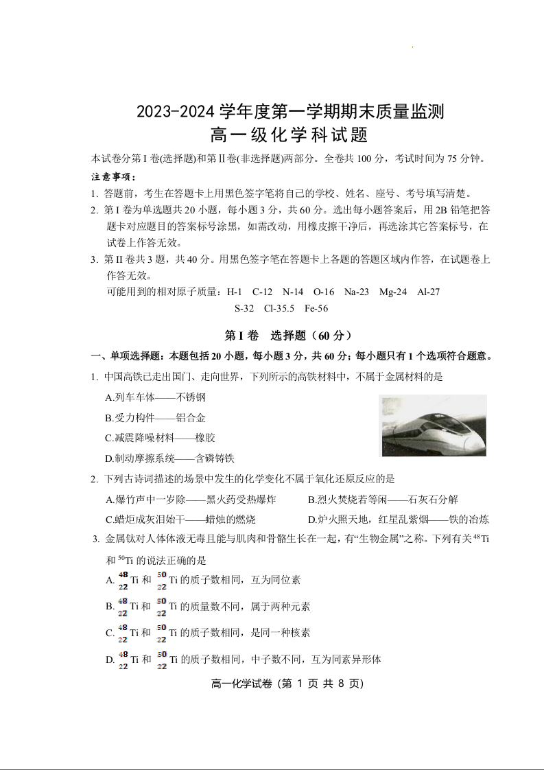 广东省汕头市澄海区2023-2024学年高一上学期1月期末测试化学