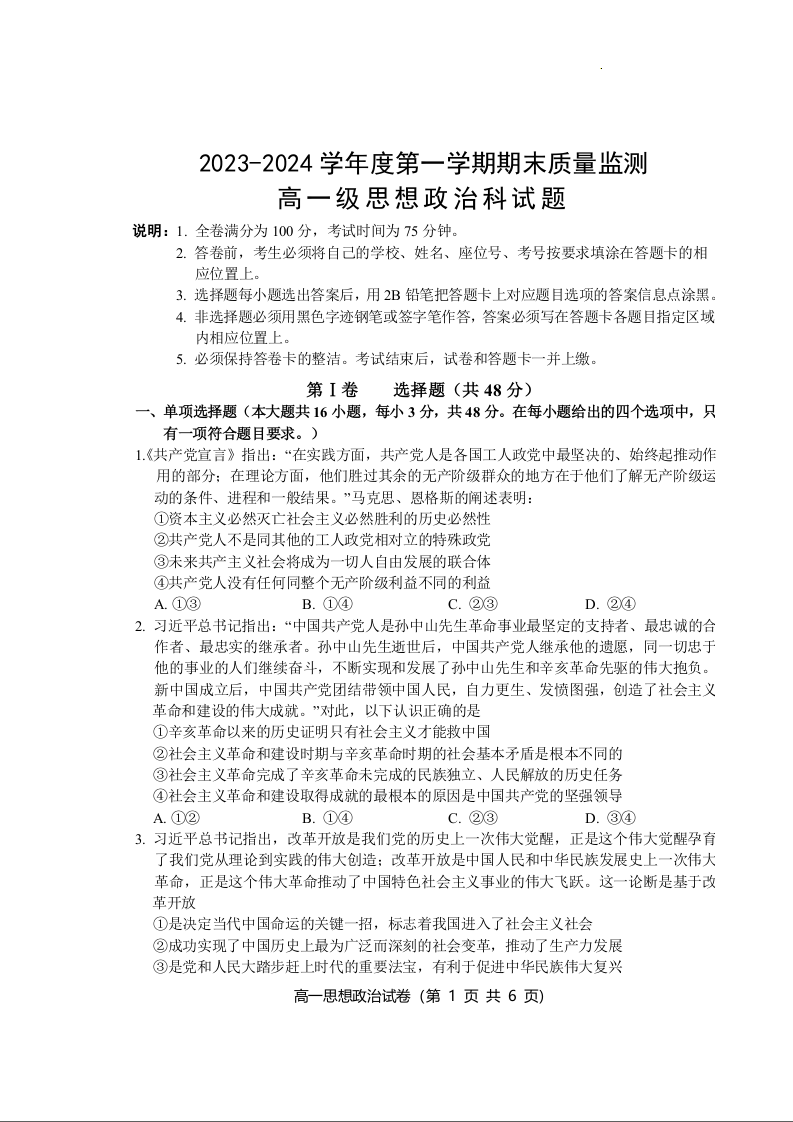广东省汕头市澄海区2023-2024学年高一上学期1月期末测试政治