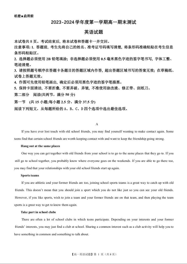 广东省阳江市2023-2024学年高一上学期1月期末测试英语+答案