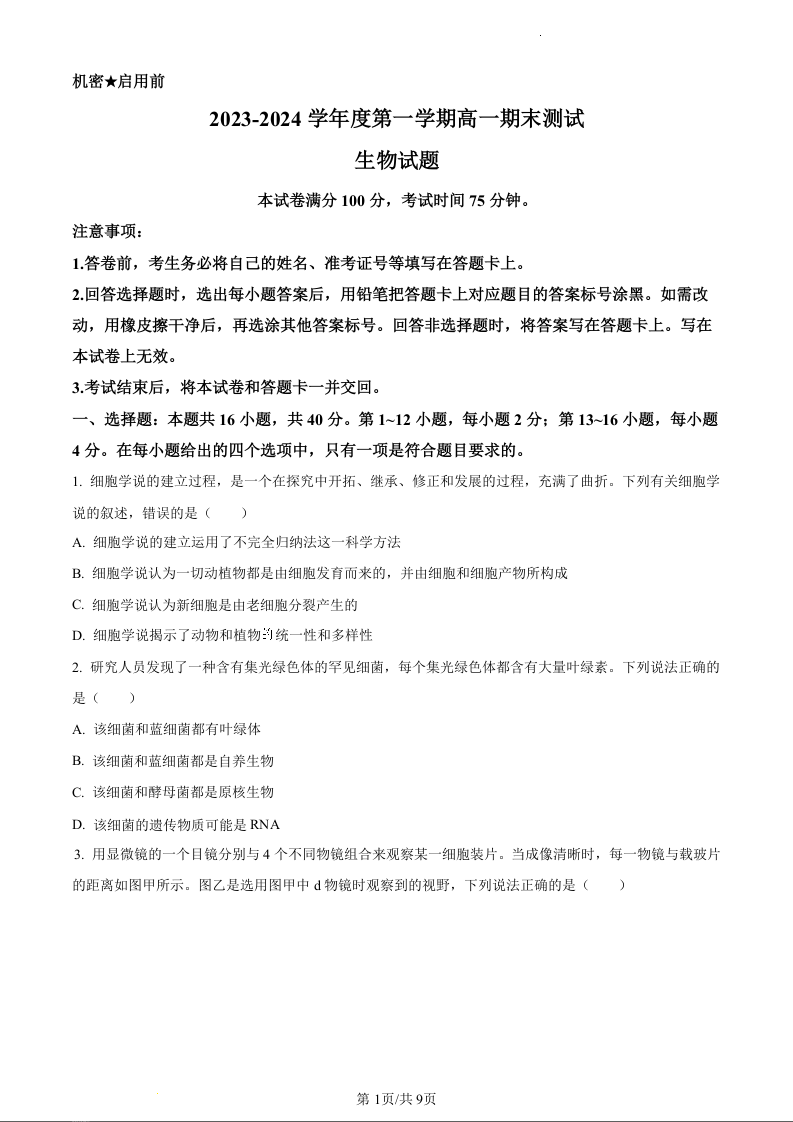 广东省阳江市2023-2024学年高一上学期1月期末测试生物(原卷版)