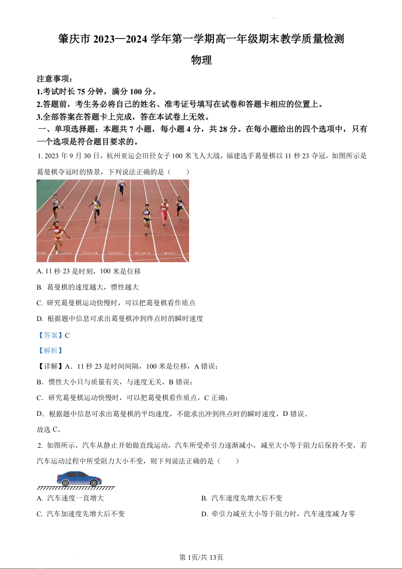 广东省肇庆市2023—2024学年高一上学期期末教学质量检测物理(精品解析版)