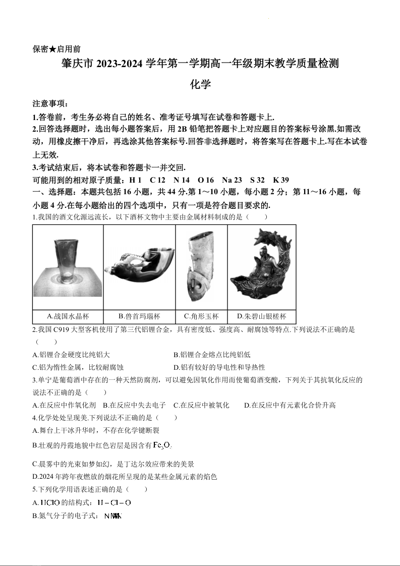 广东省肇庆市2023—2024学年高一上学期期末教学质量检测化学+答案