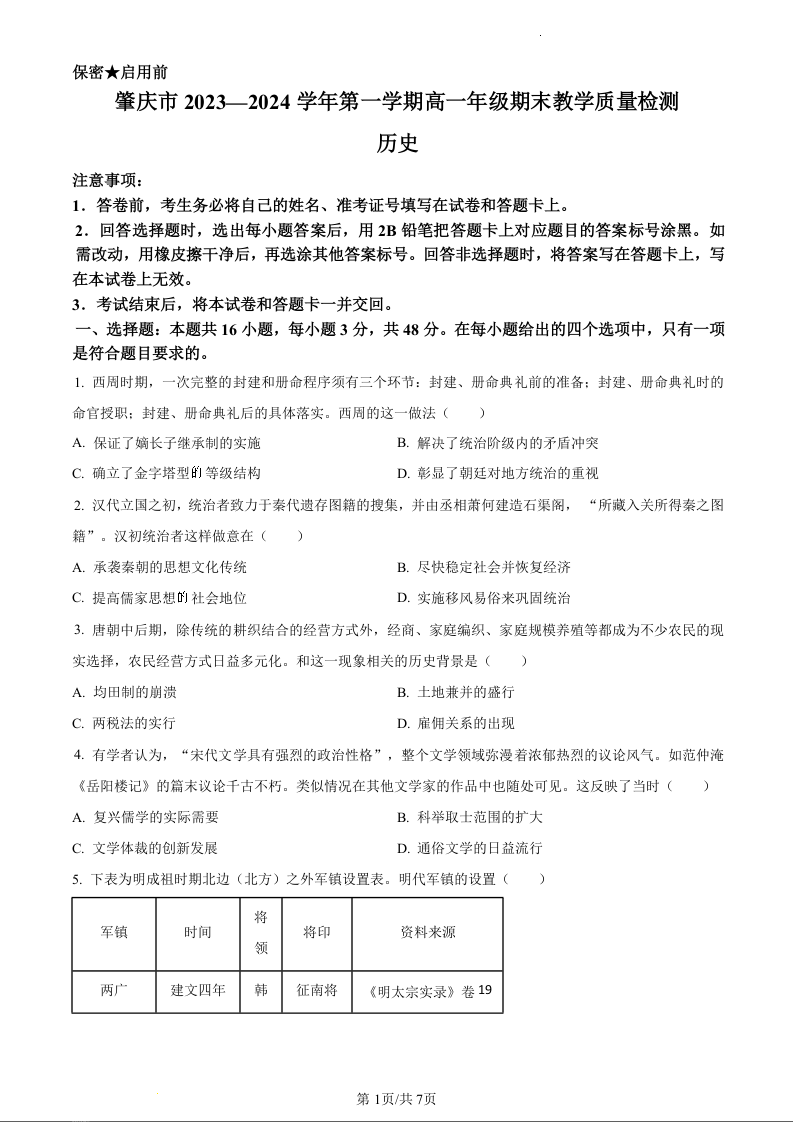 广东省肇庆市2023—2024学年高一上学期期末教学质量检测历史(原卷版)