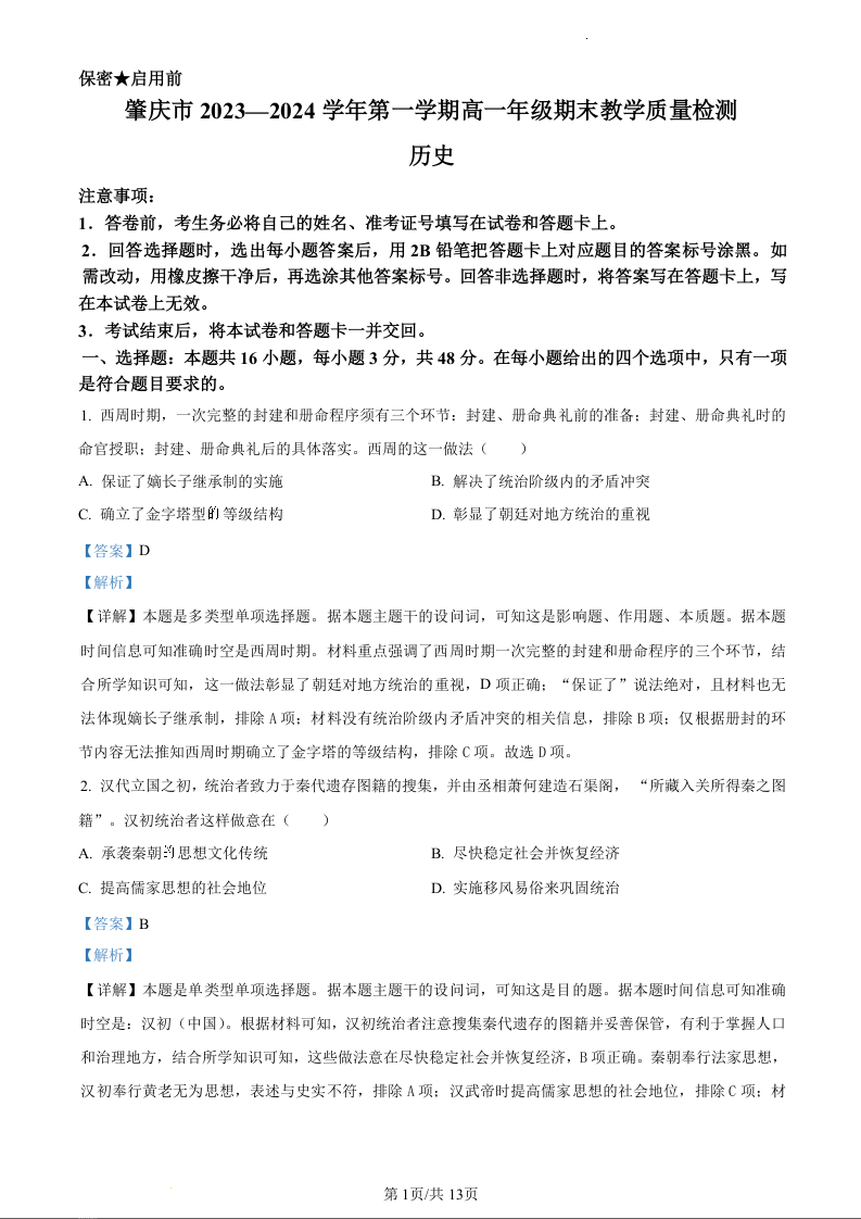 广东省肇庆市2023—2024学年高一上学期期末教学质量检测历史(精品解析版)