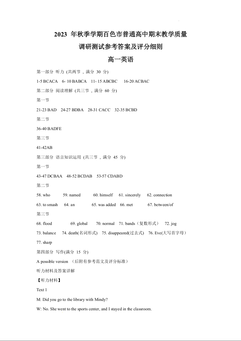 广西壮族自治区百色市2023-2024学年高一上学期1月期末考试英语答案