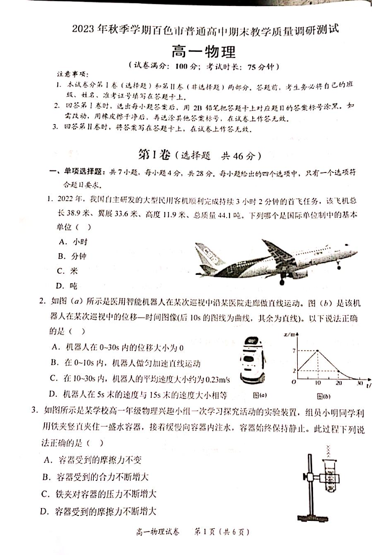 广西壮族自治区百色市2023-2024学年高一上学期1月期末考试物理