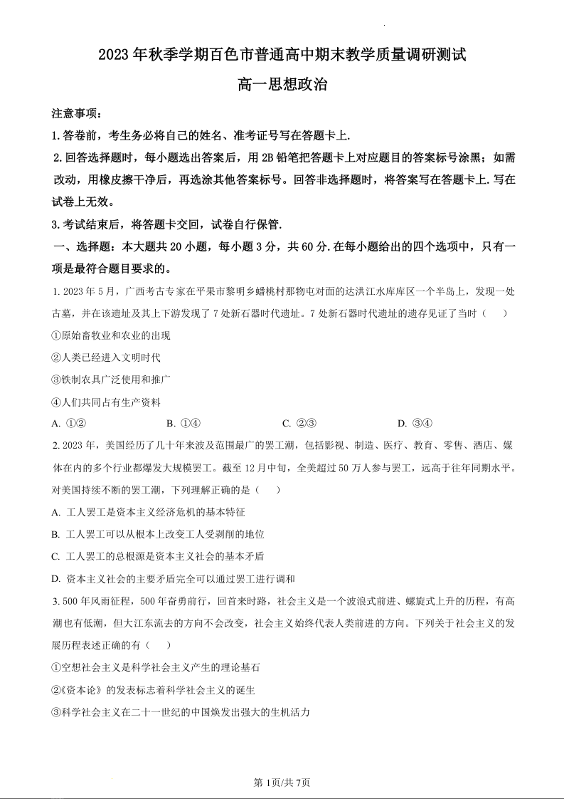 广西壮族自治区百色市2023-2024学年高一上学期1月期末考试政治(原卷版)